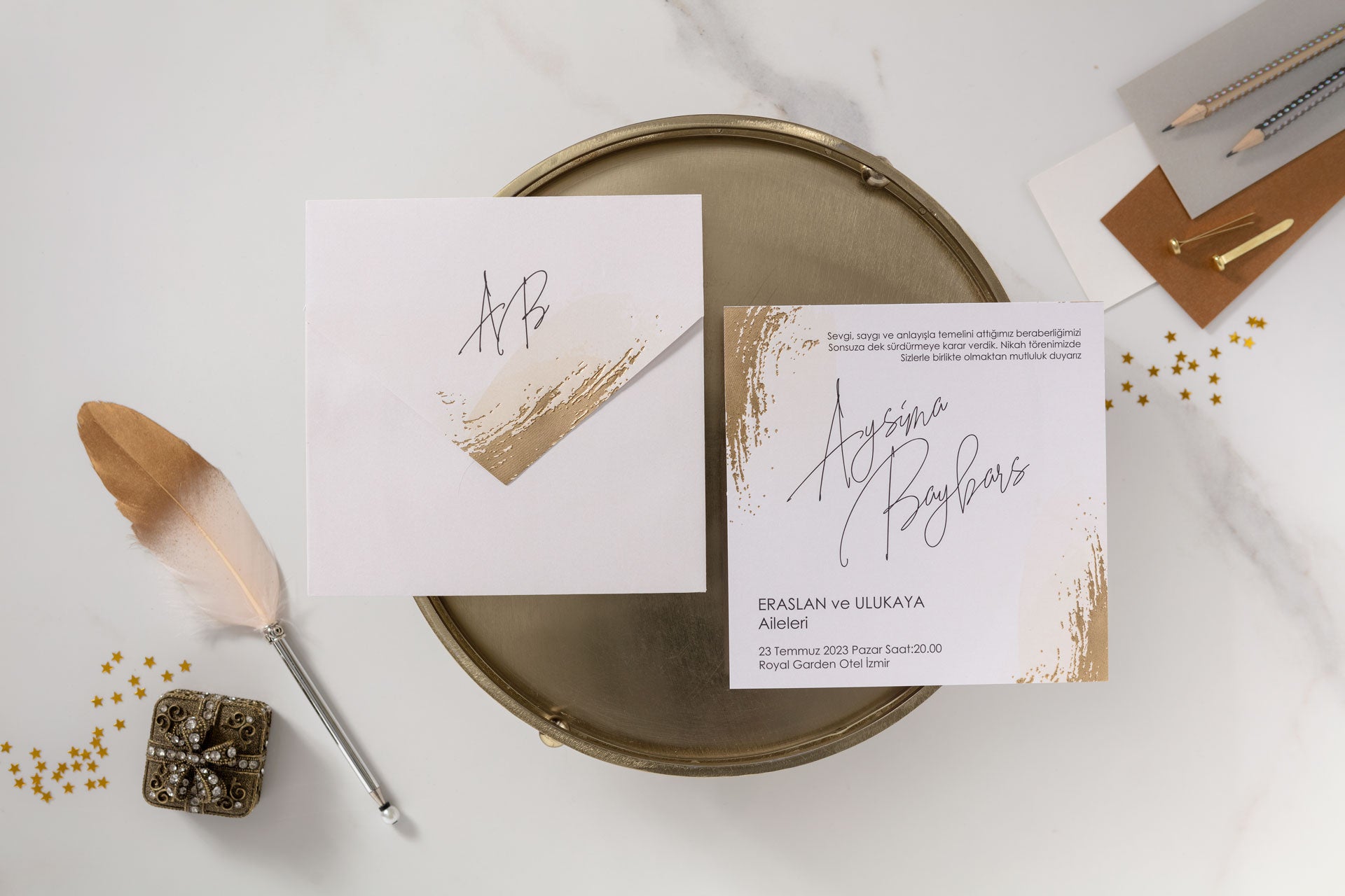 és tartalmazza a képeken látható aranyfóliázott borítékot is.