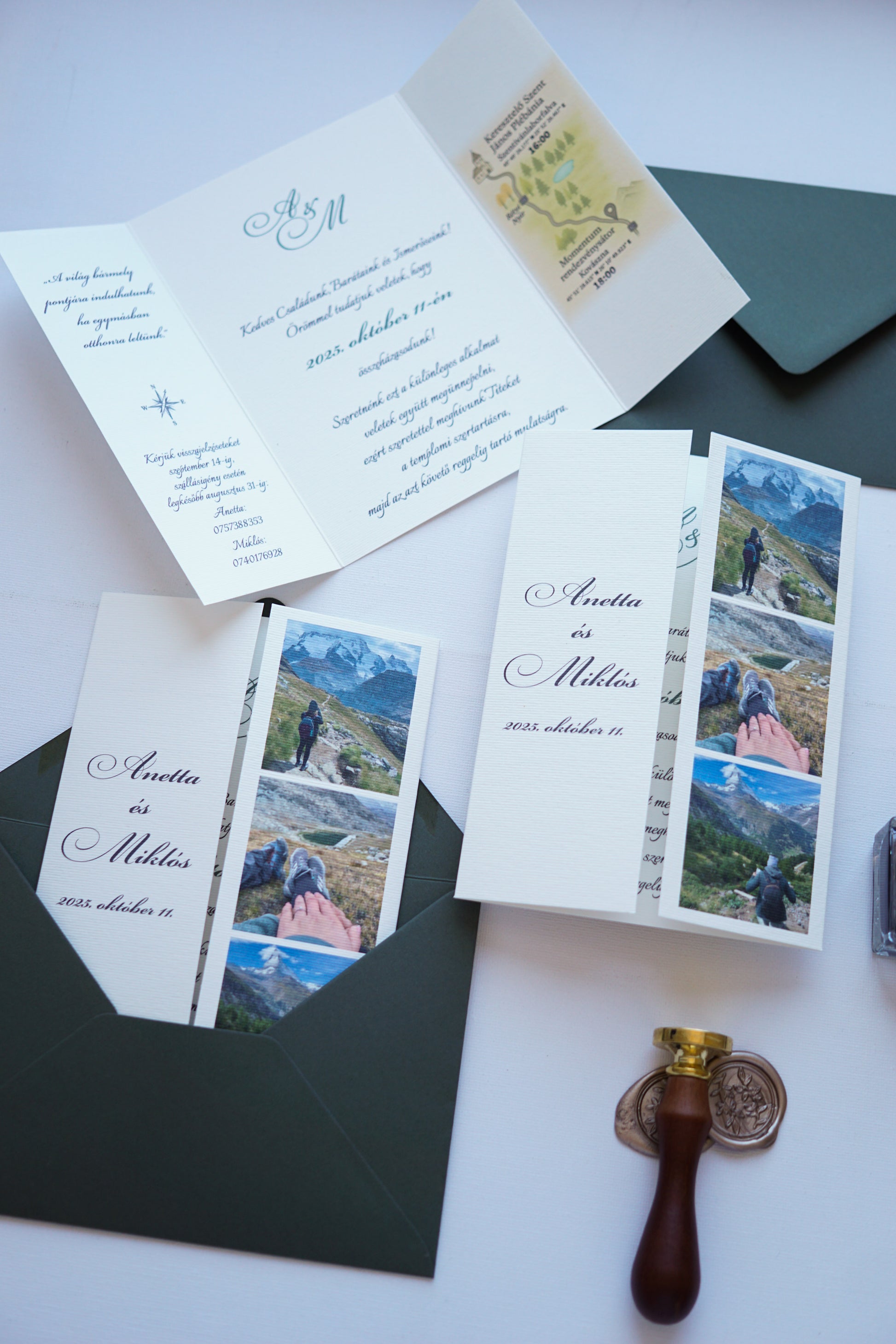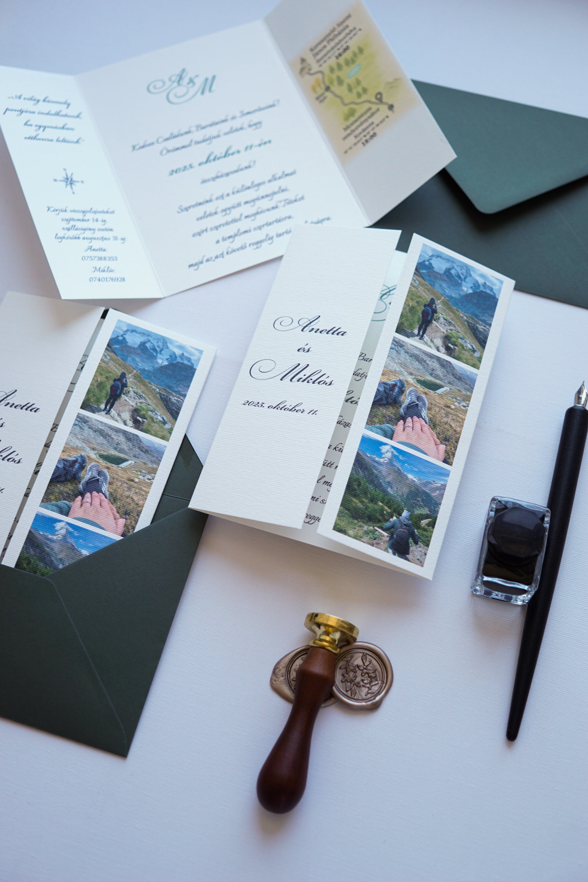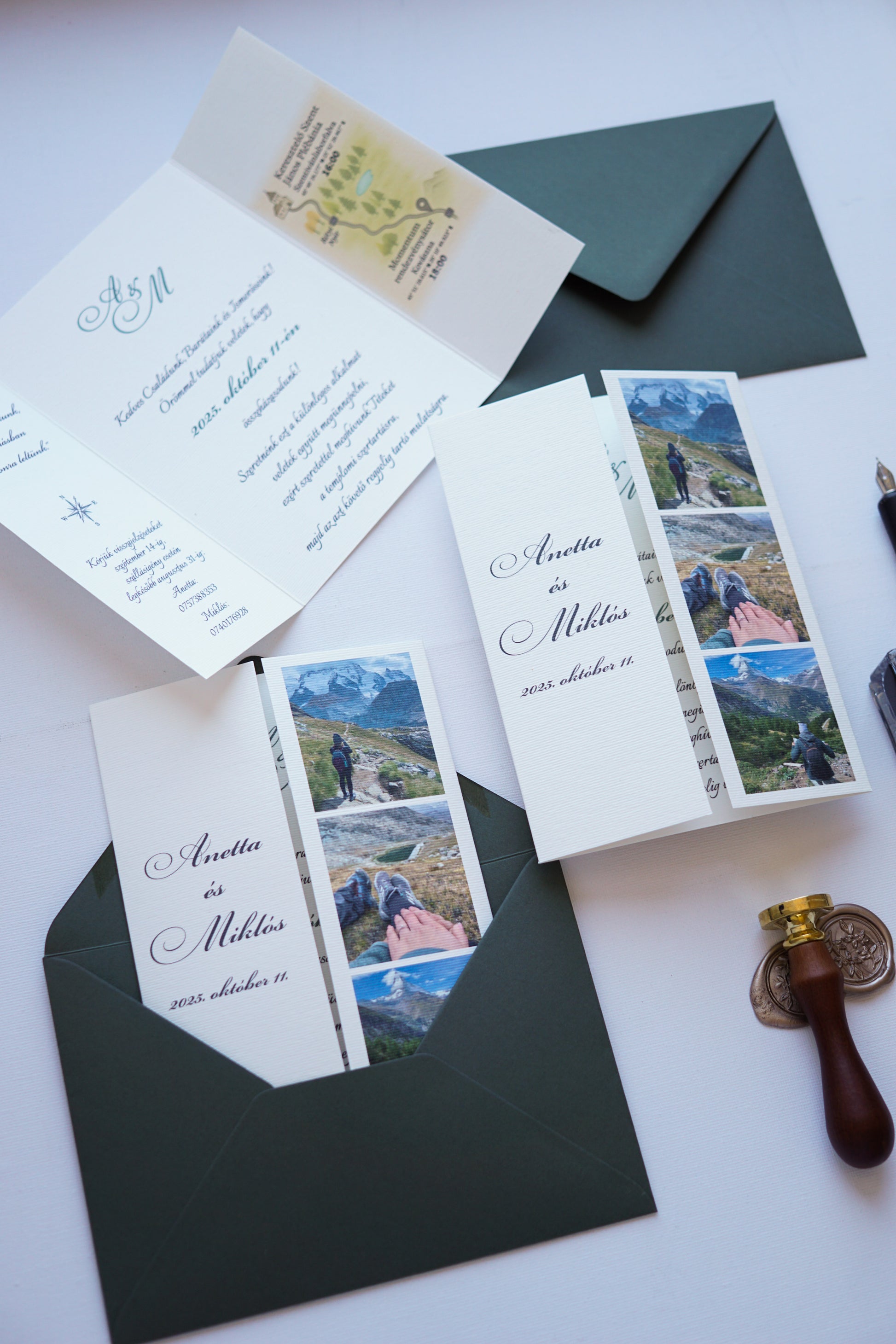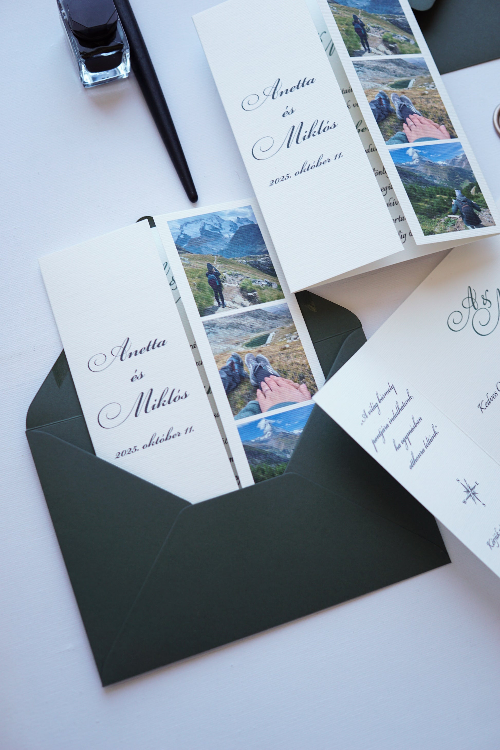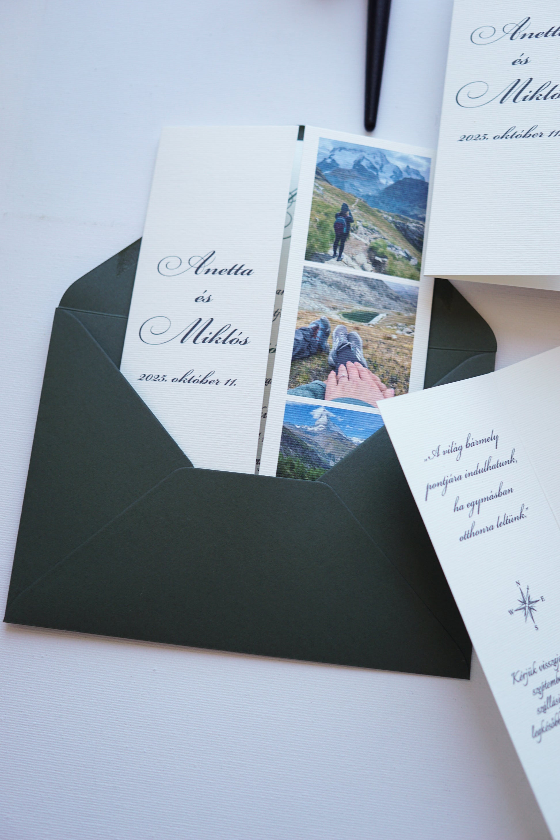 Kérhettek hozzá borítékot is, a boríték lehet sötétzöld, fenyőzöld, fehér, bézs, vagy akár más színű is, opcióként viaszpecsét is kérhettek a meghívóhoz.