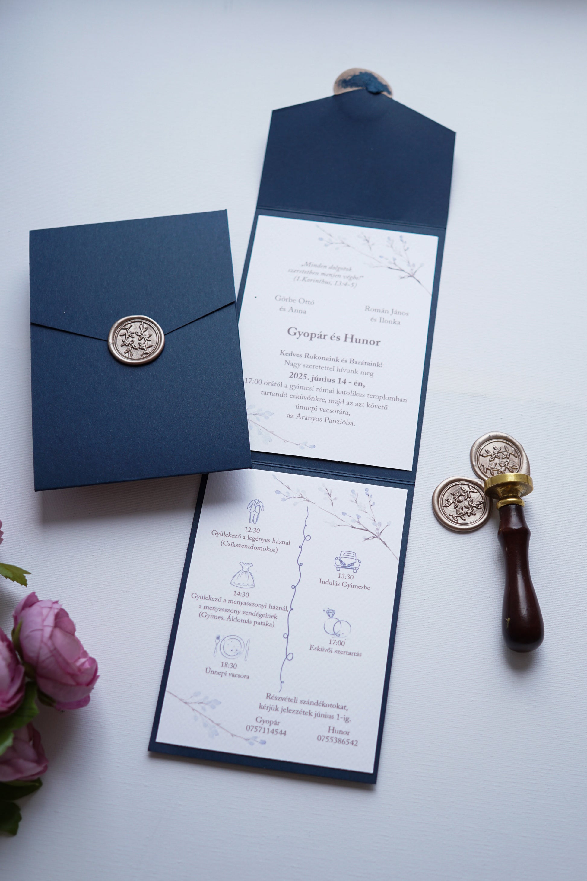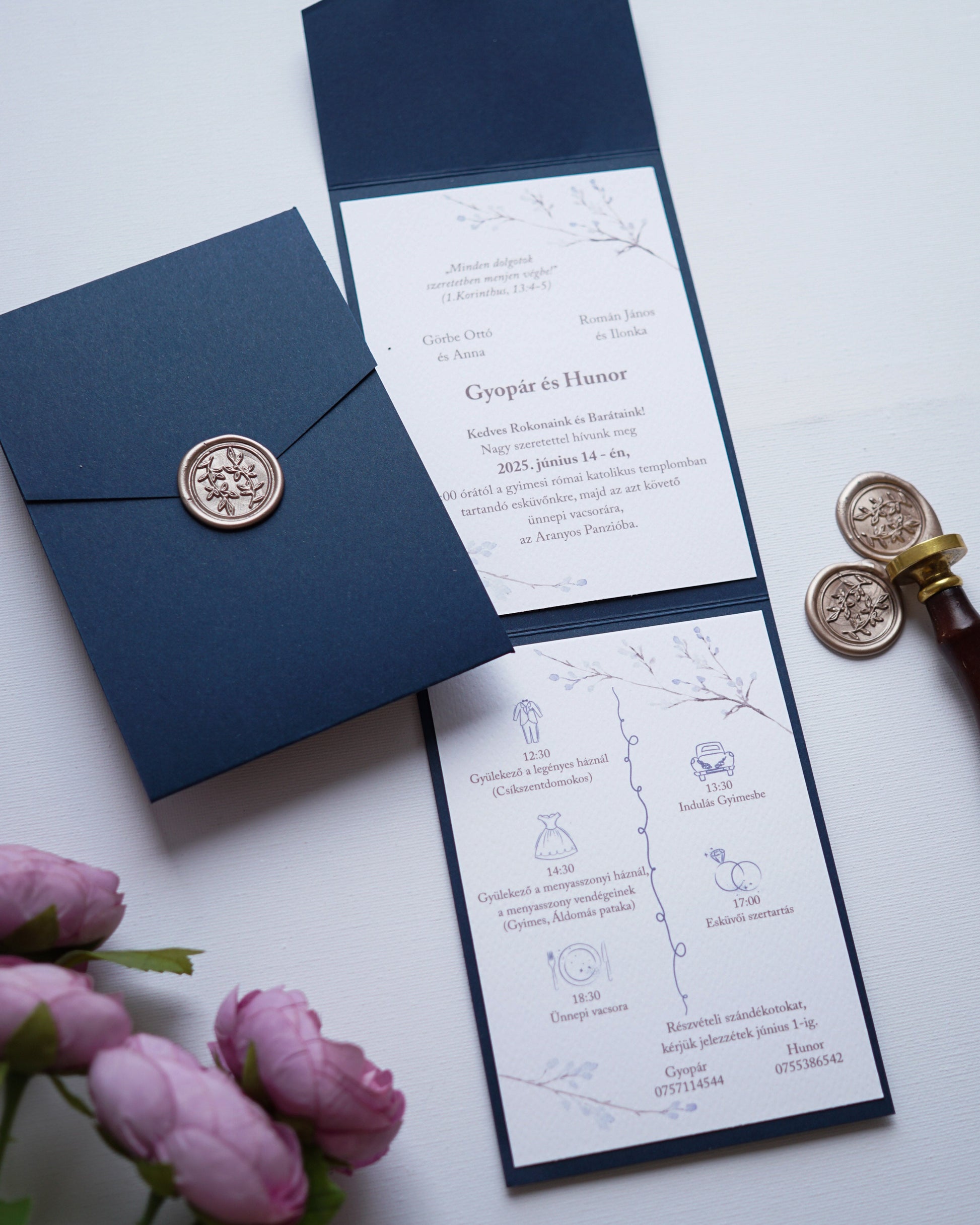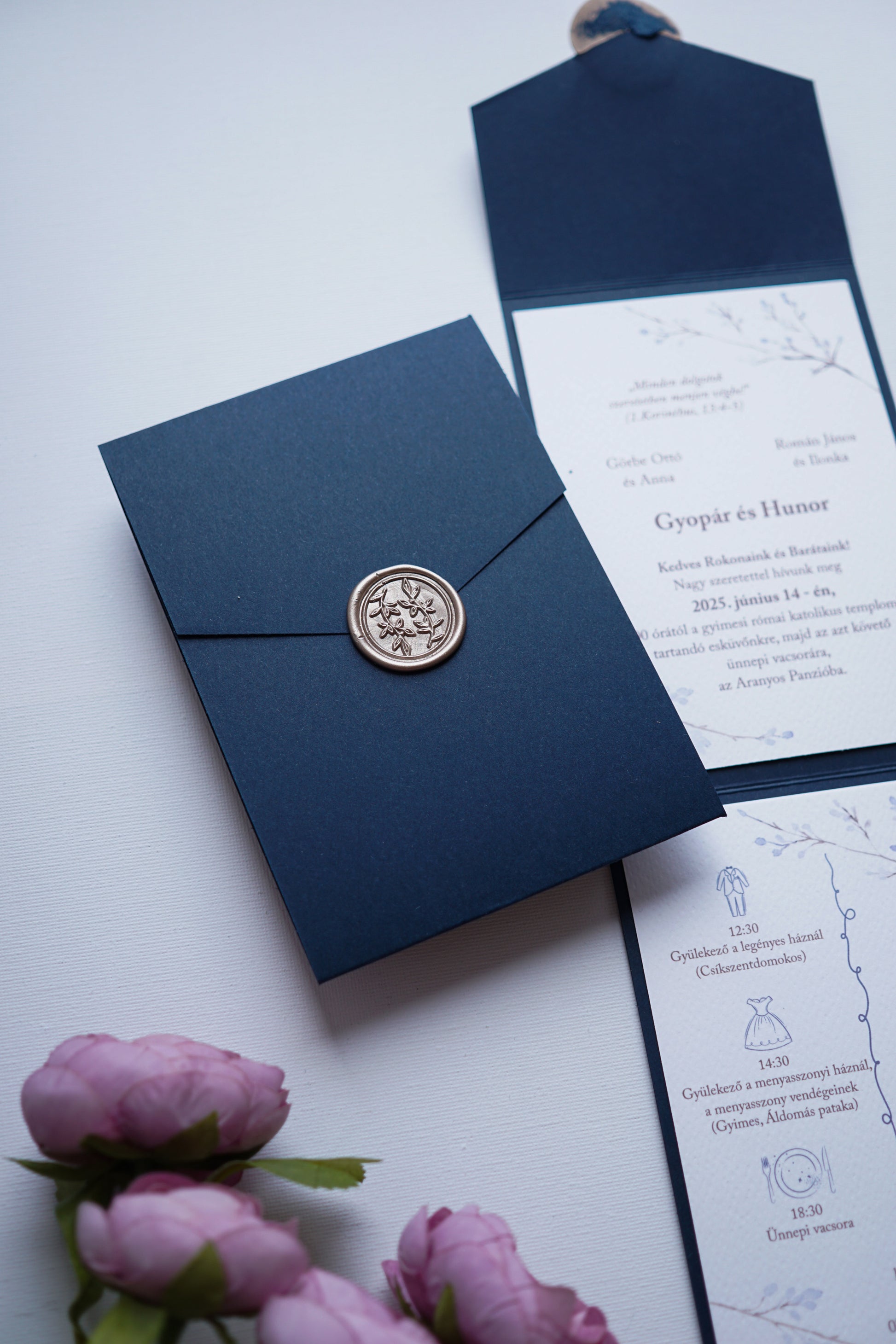 A meghívót 250 g/m2-es prémium minőségű sima felületű papírból készítjük, kérésre lehet (a képeken látható) tengerészkék vagy más színű papírból is, példáúl fehér, bézs, rózsaszín, zöld, fekete, stb.