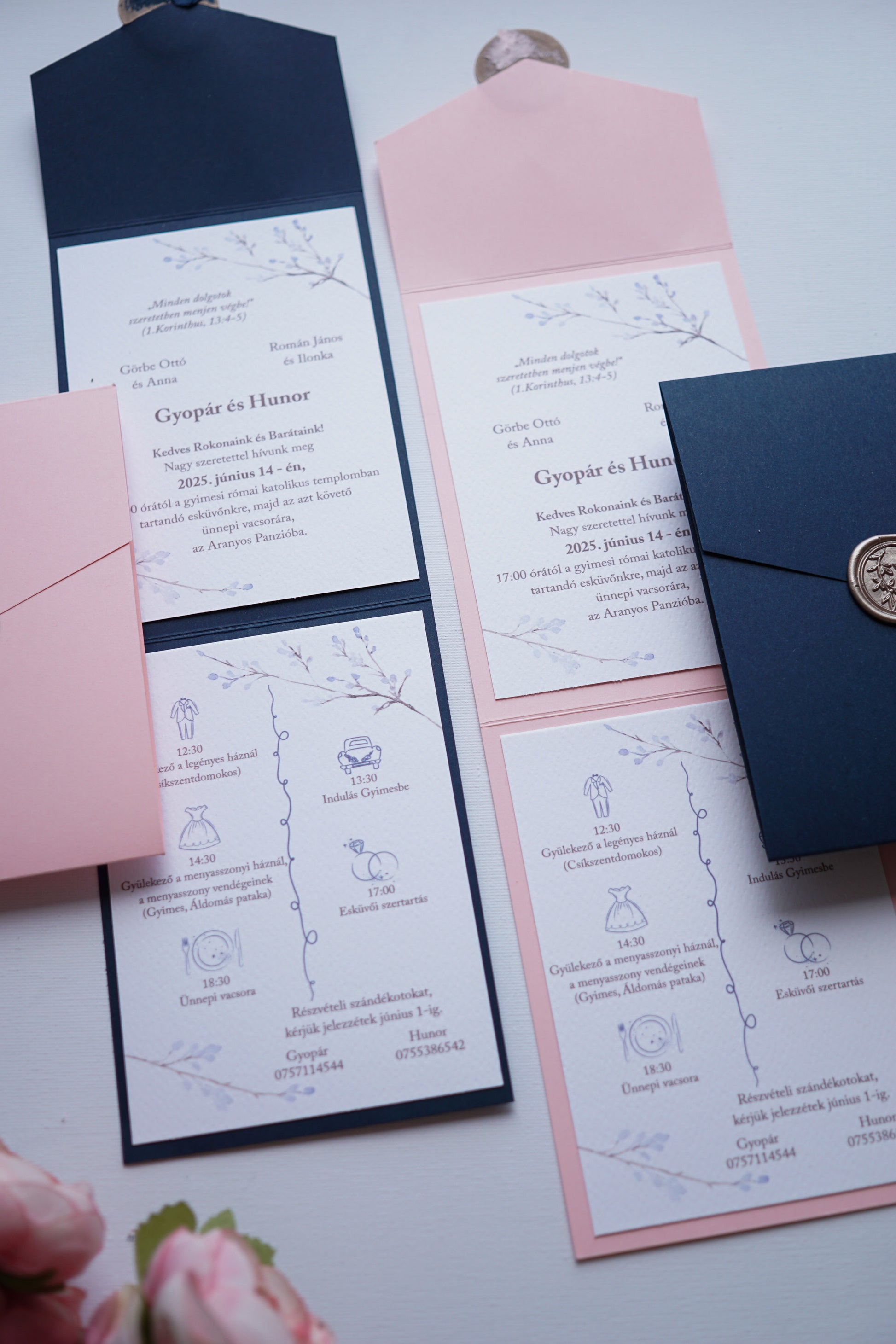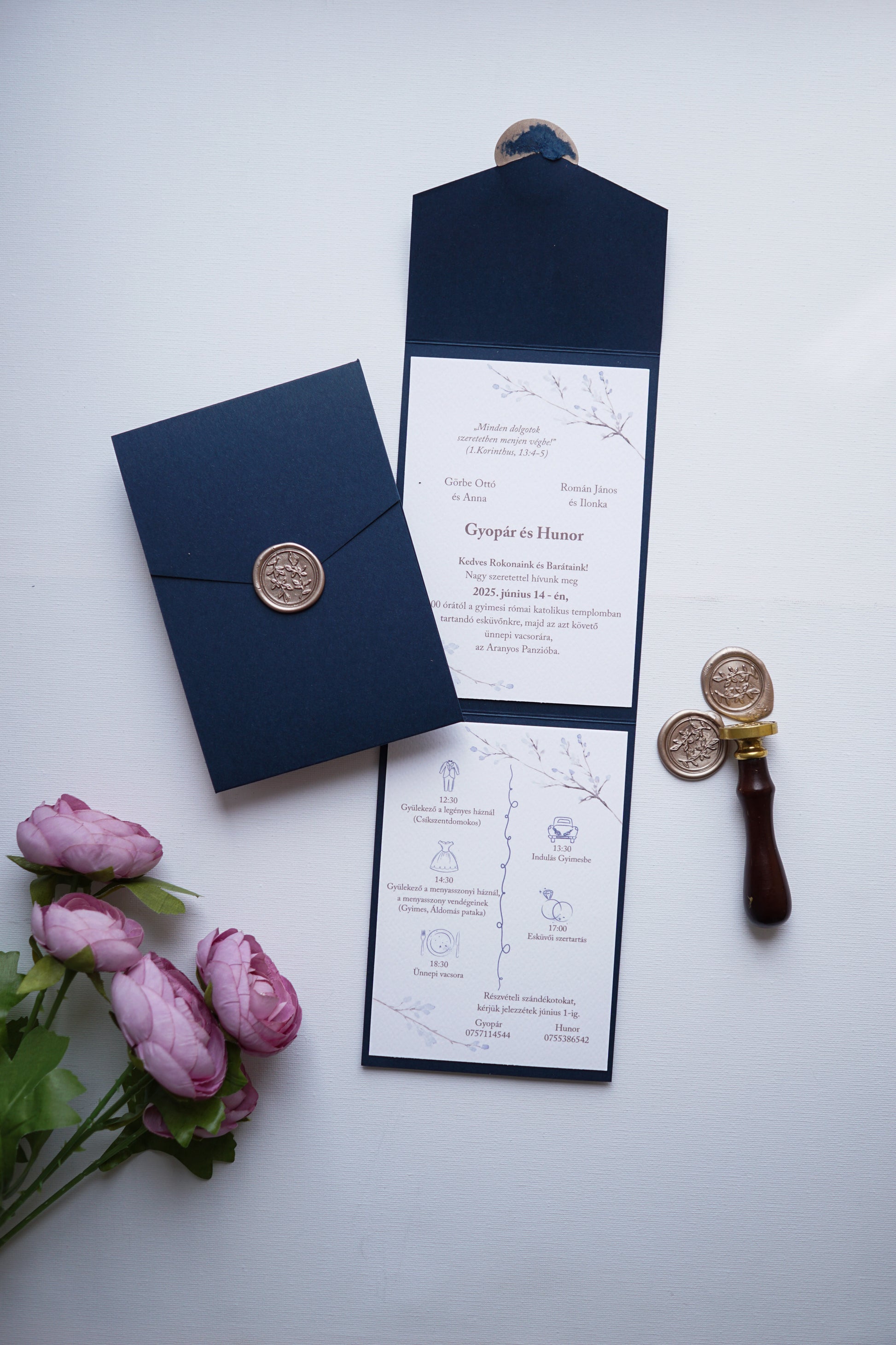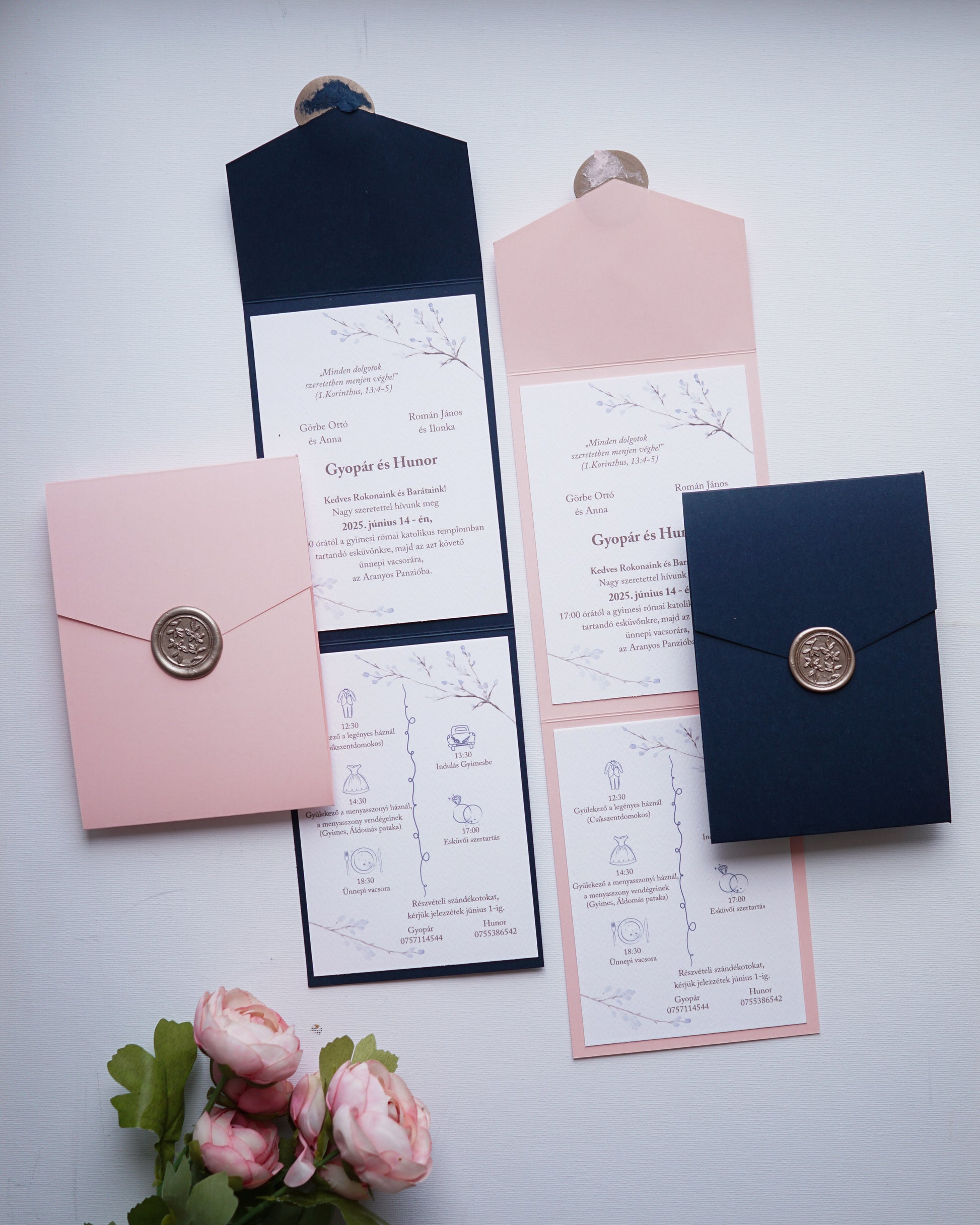 A meghívót 250 g/m2-es prémium minőségű sima felületű papírból készítjük, kérésre lehet (a képeken látható) tengerészkék vagy más színű papírból is, példáúl fehér, bézs, rózsaszín, zöld, fekete, stb.