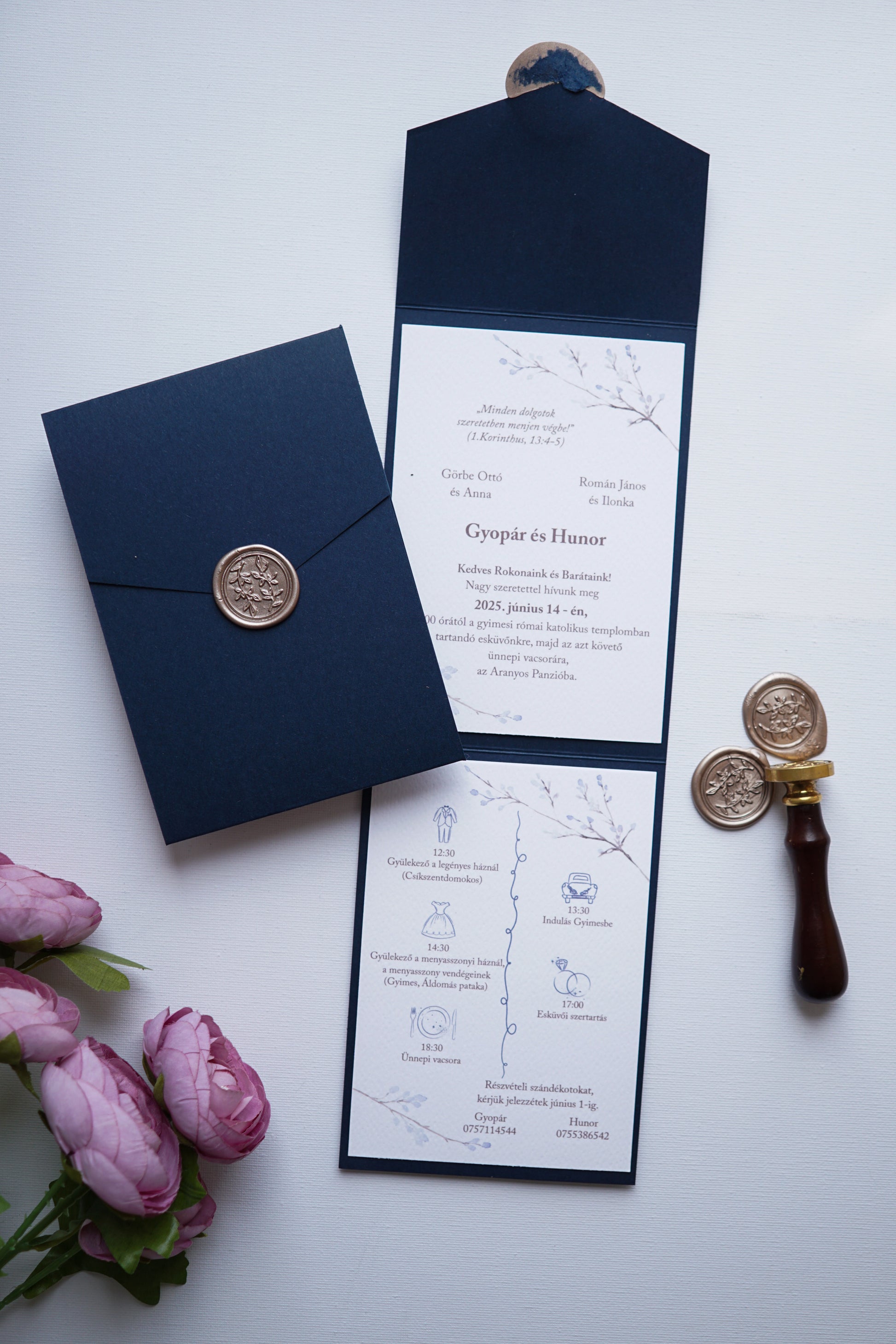 EM77 - Kinyitható tokos meghívó, tengerészkék színben.