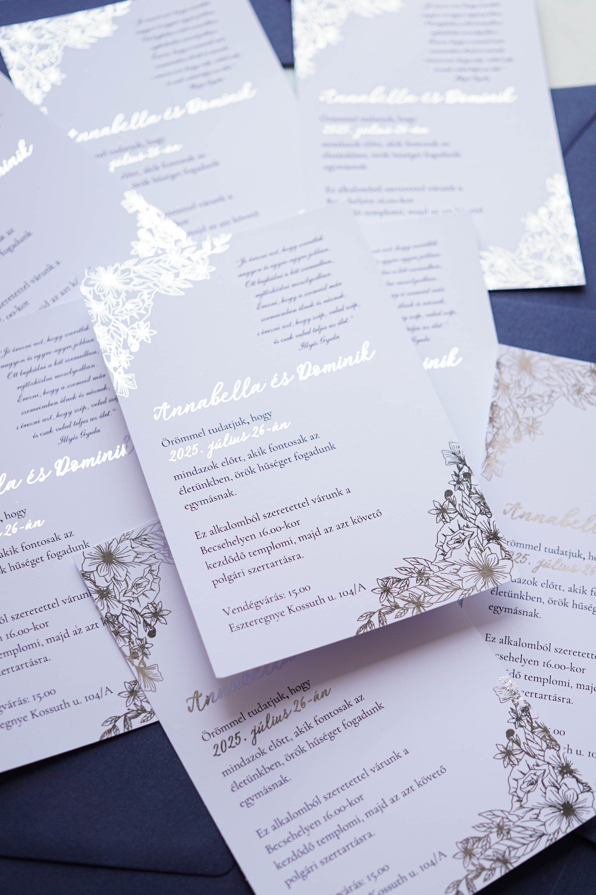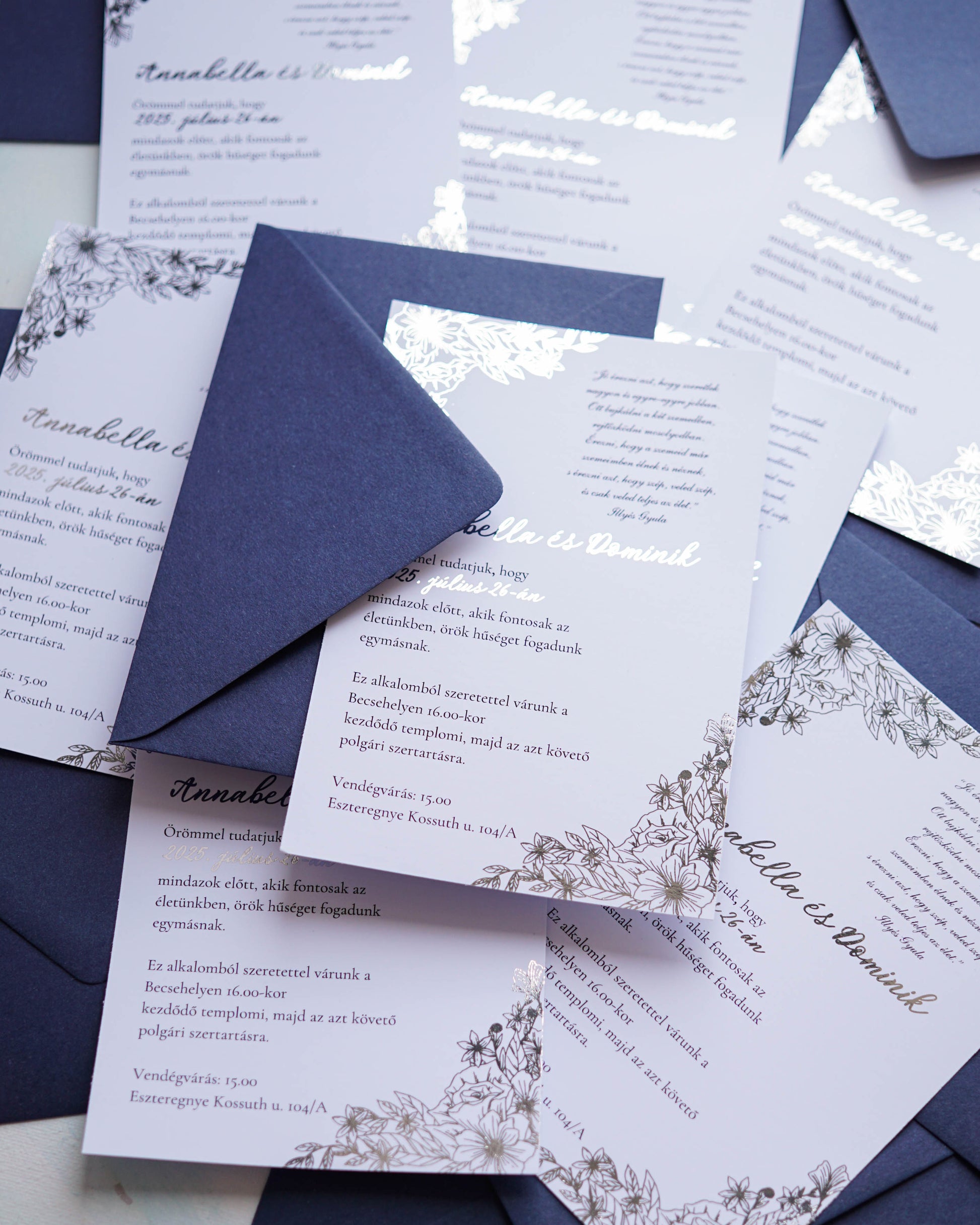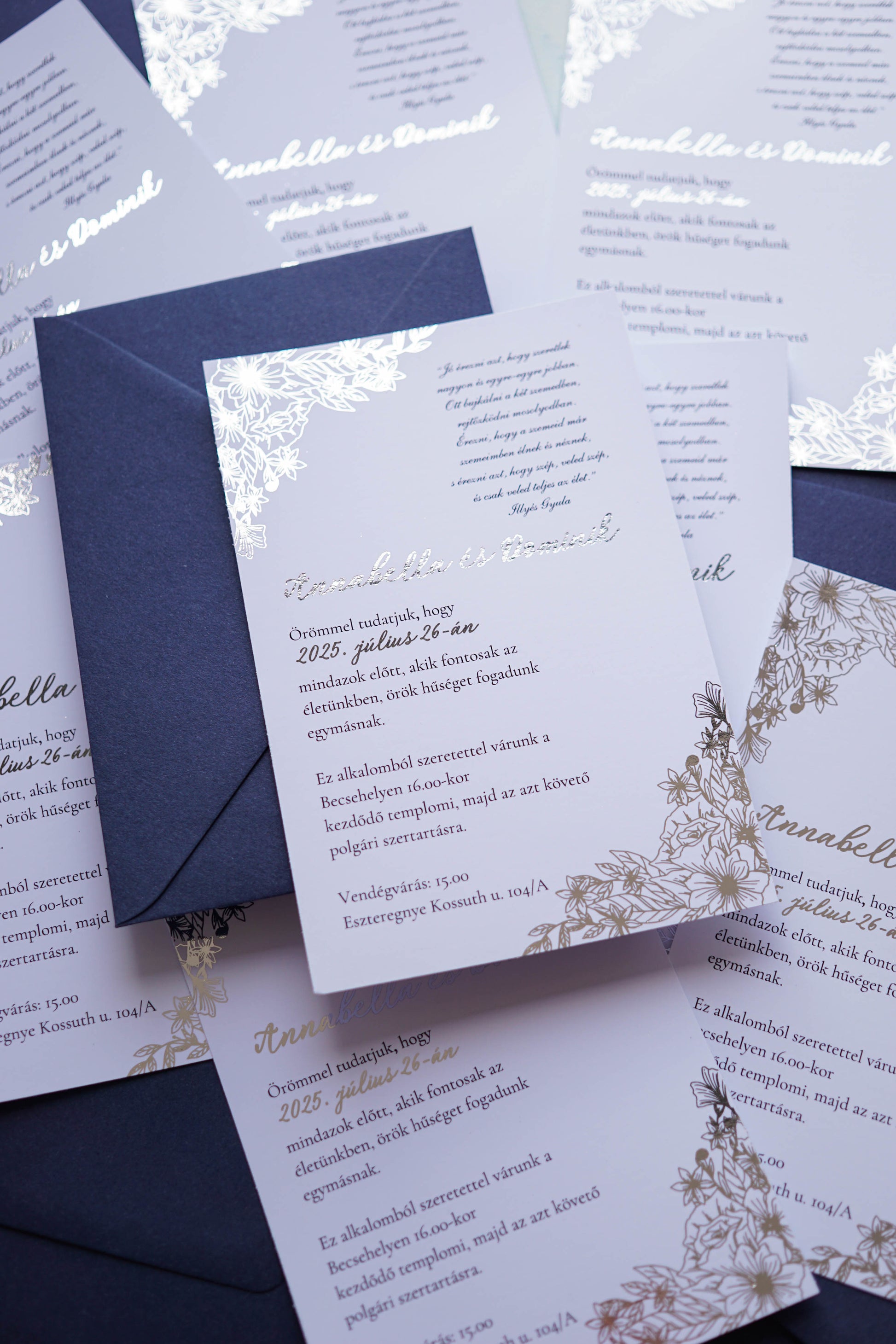EM80 - Ezüstfóliázott virágmintás esküvői meghívó, tengerészkék borítékkal