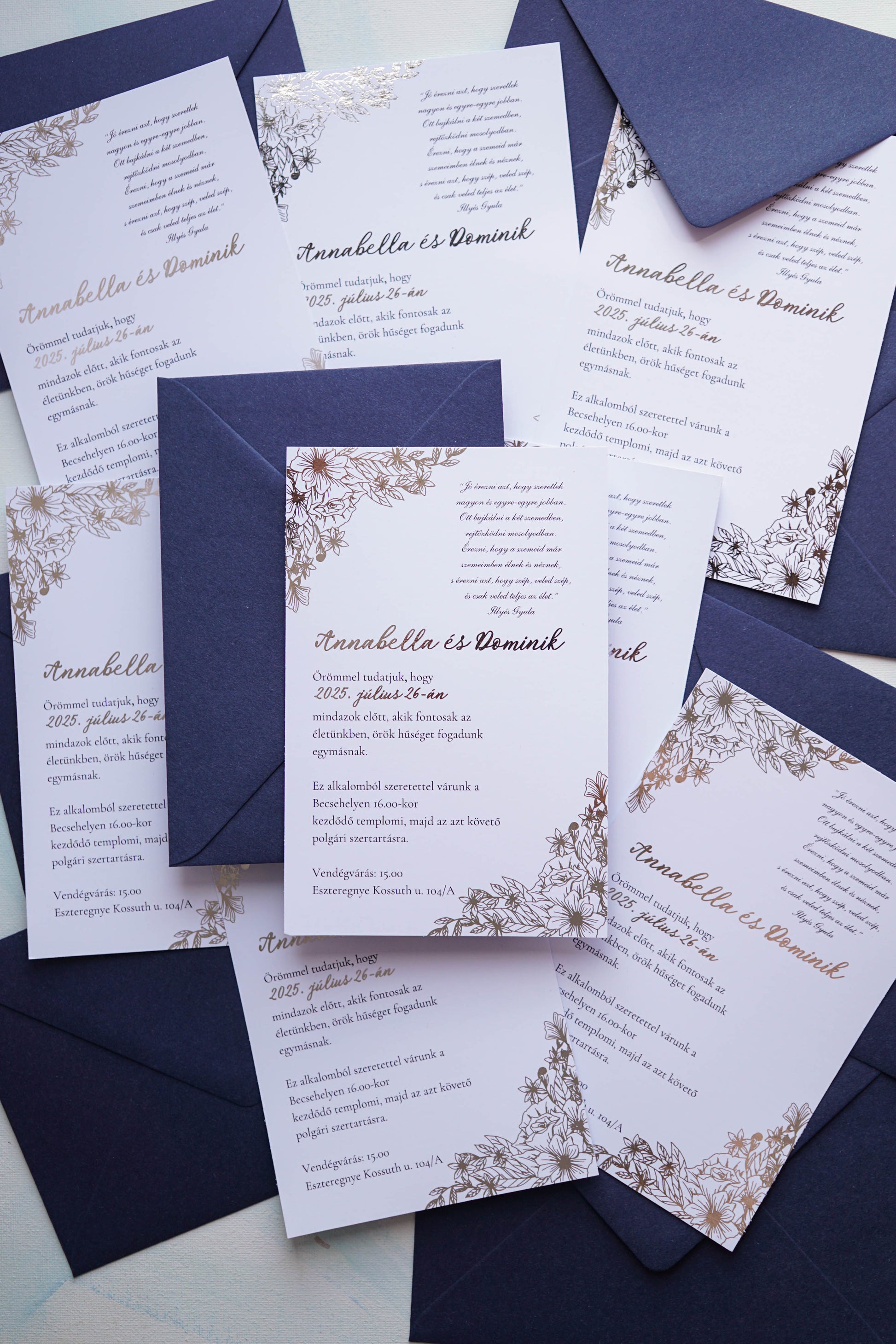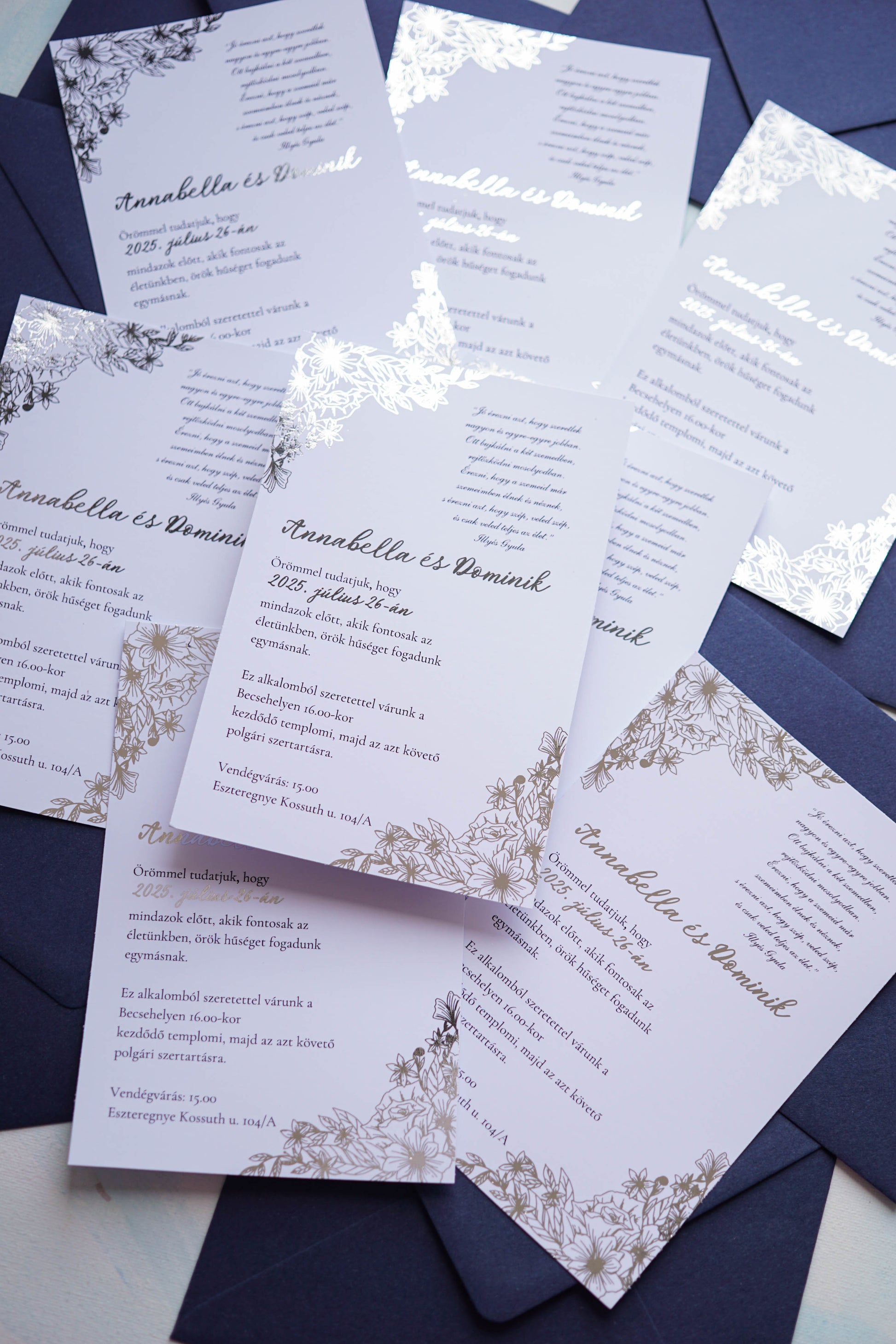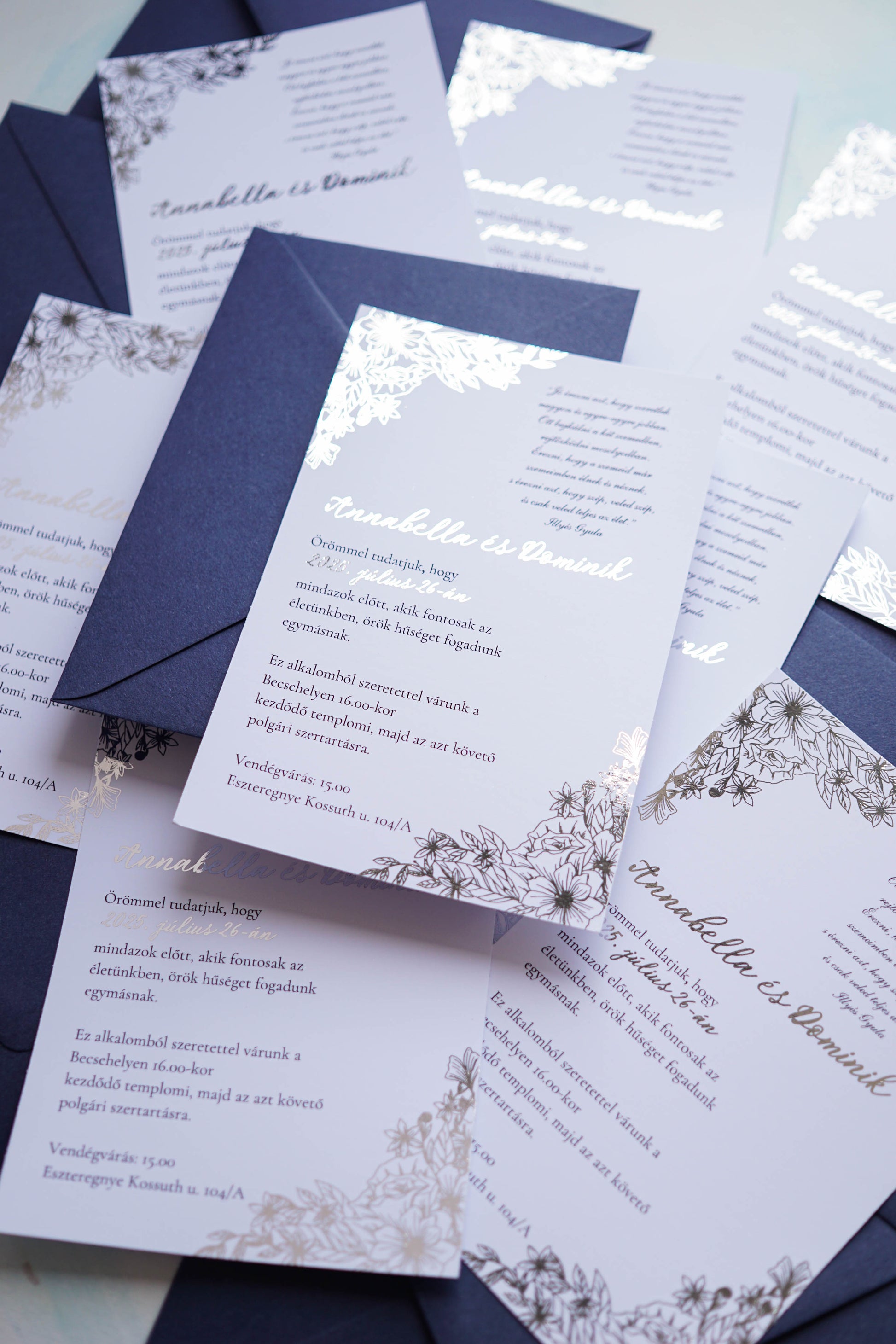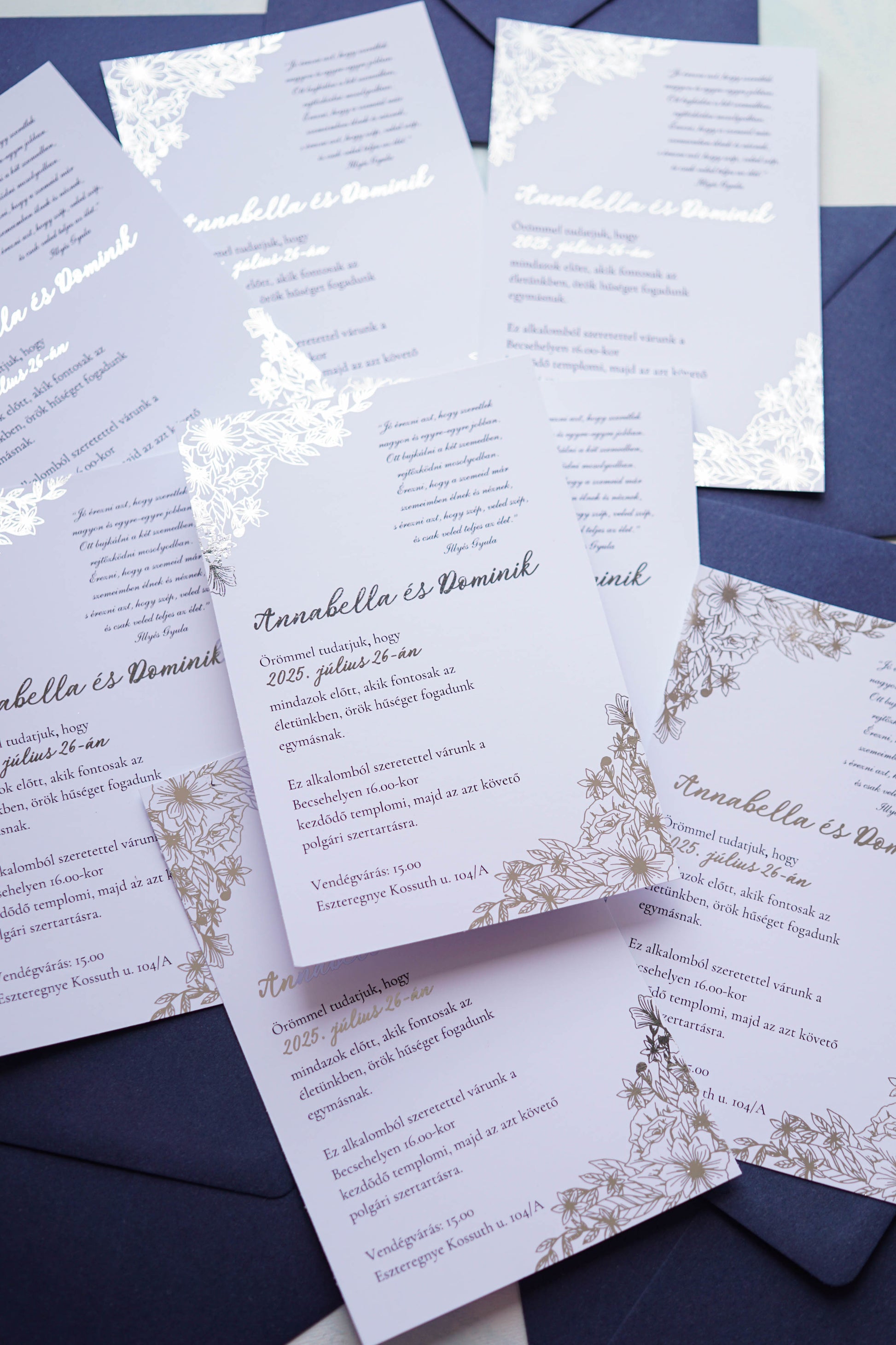 EM80 - Ezüstfóliázott virágmintás esküvői meghívó, tengerészkék borítékkal