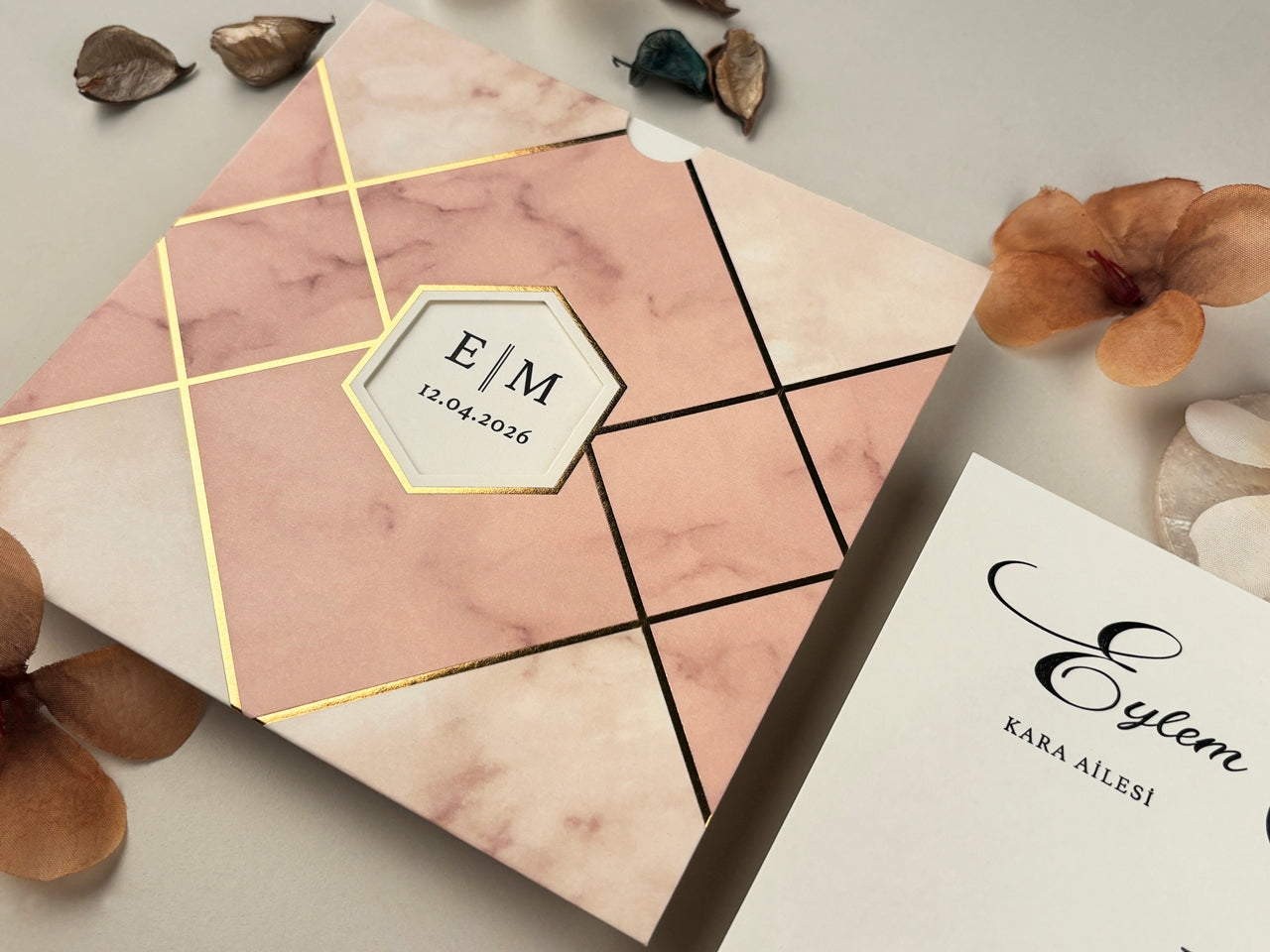 85860 - Rózsaszín tokos esküvői meghívó geometrikus mintával
