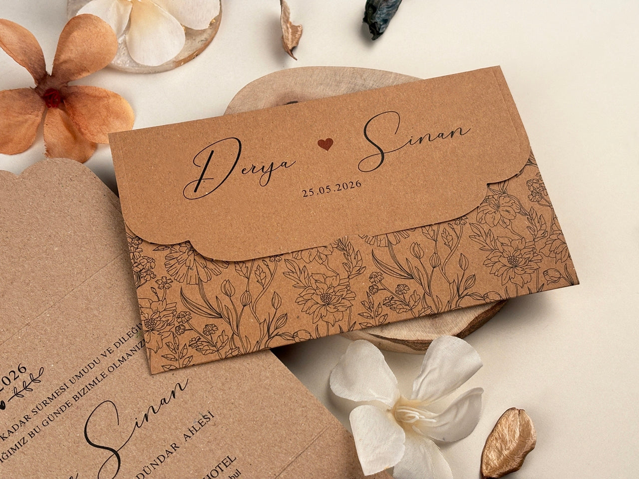 85852 - Összehajtható esküvői meghívó virágmintával kraft papírból