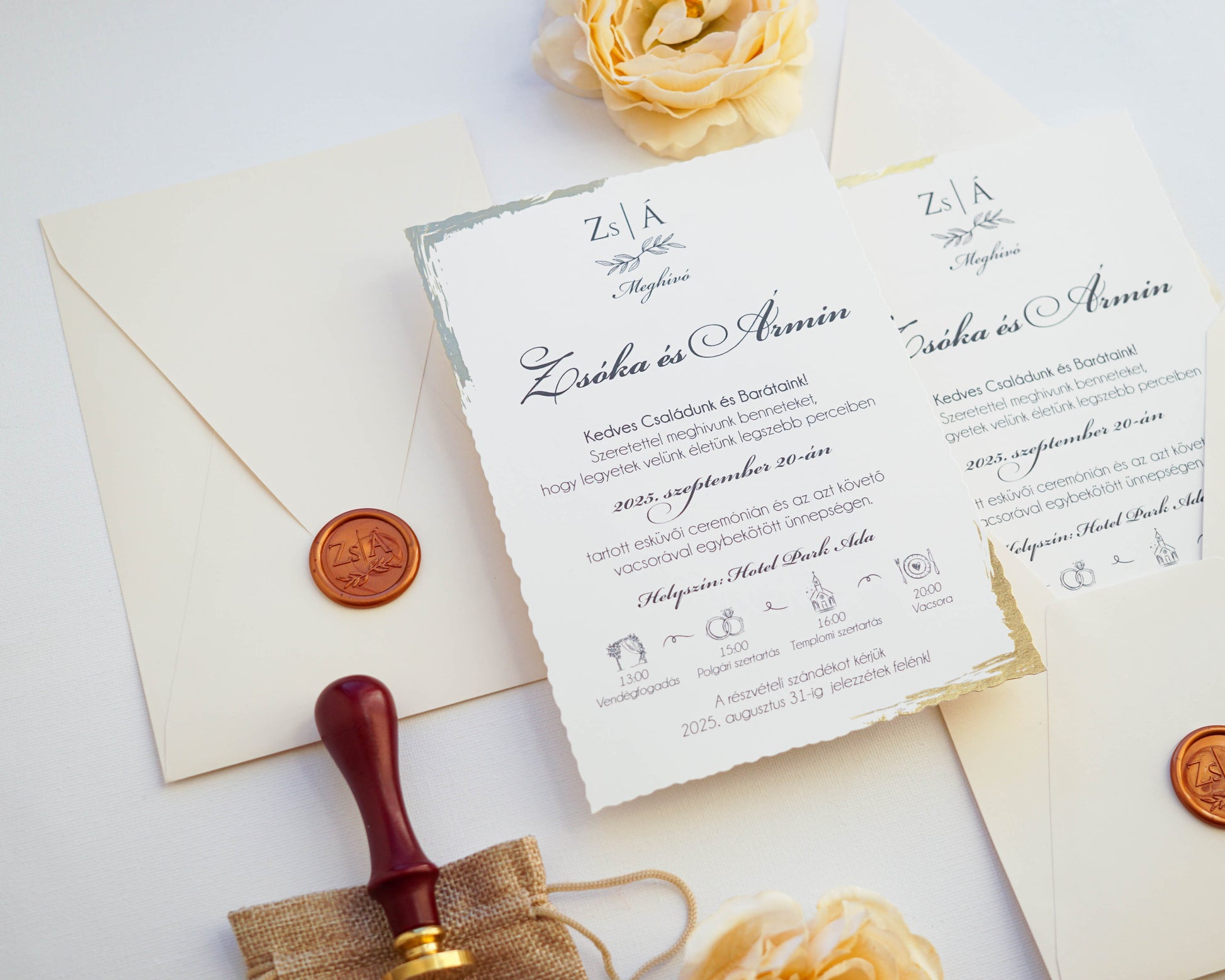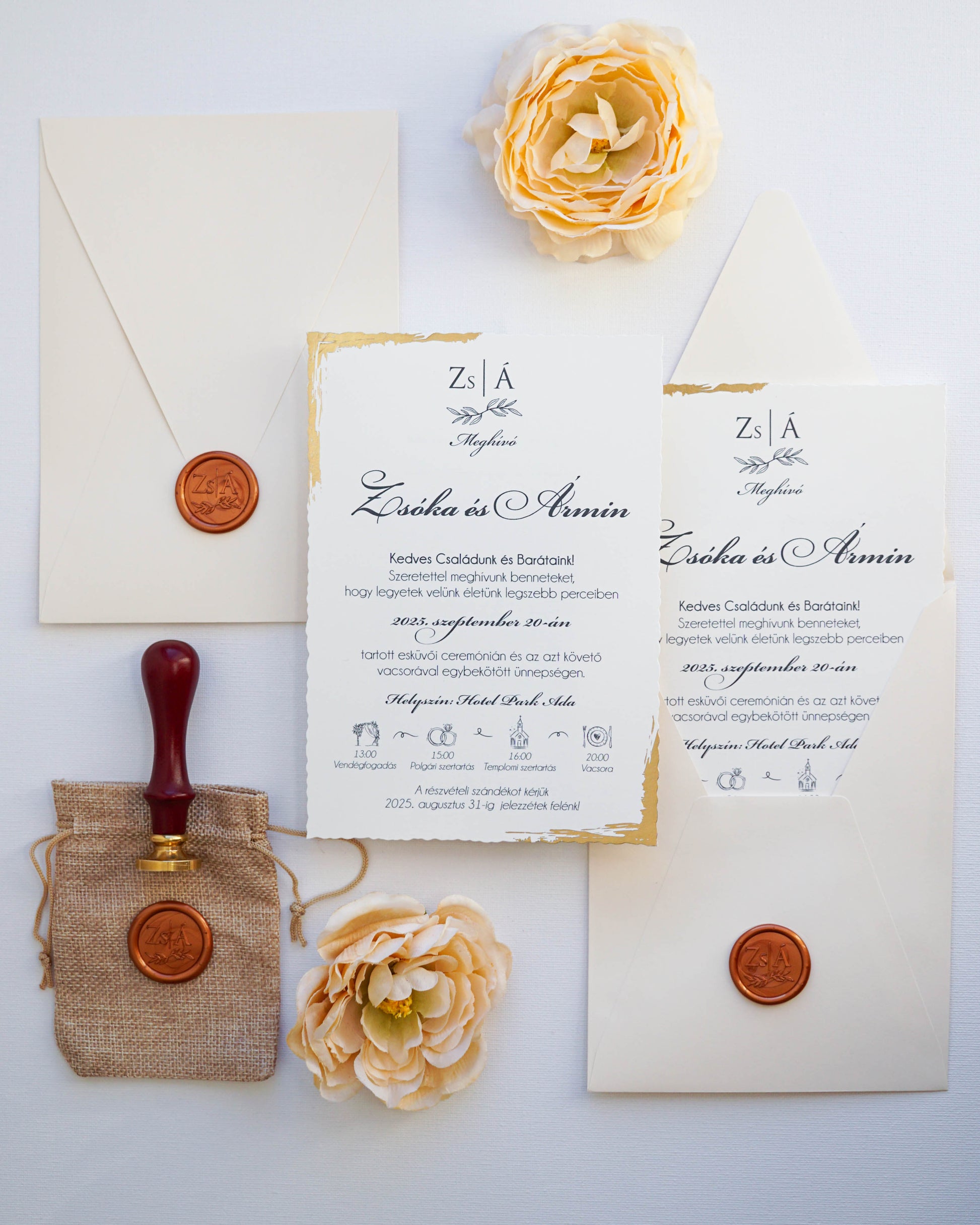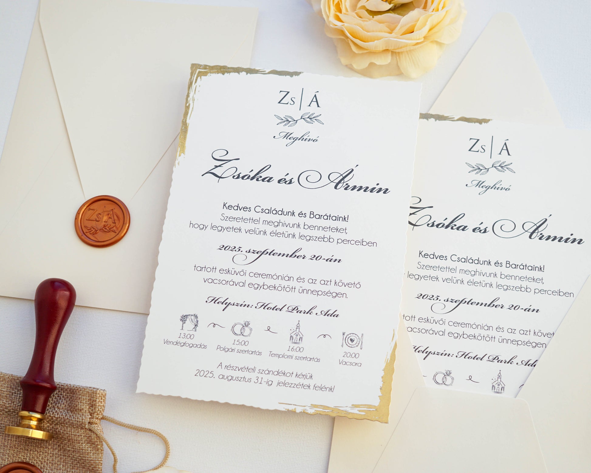 A képeken látható viaszpecsét nincs benne a meghívó árában, ez külön IDE KATTINTVA választható a meghívóhoz, az ára 2,5 lej vagy kb 210 ft/db.