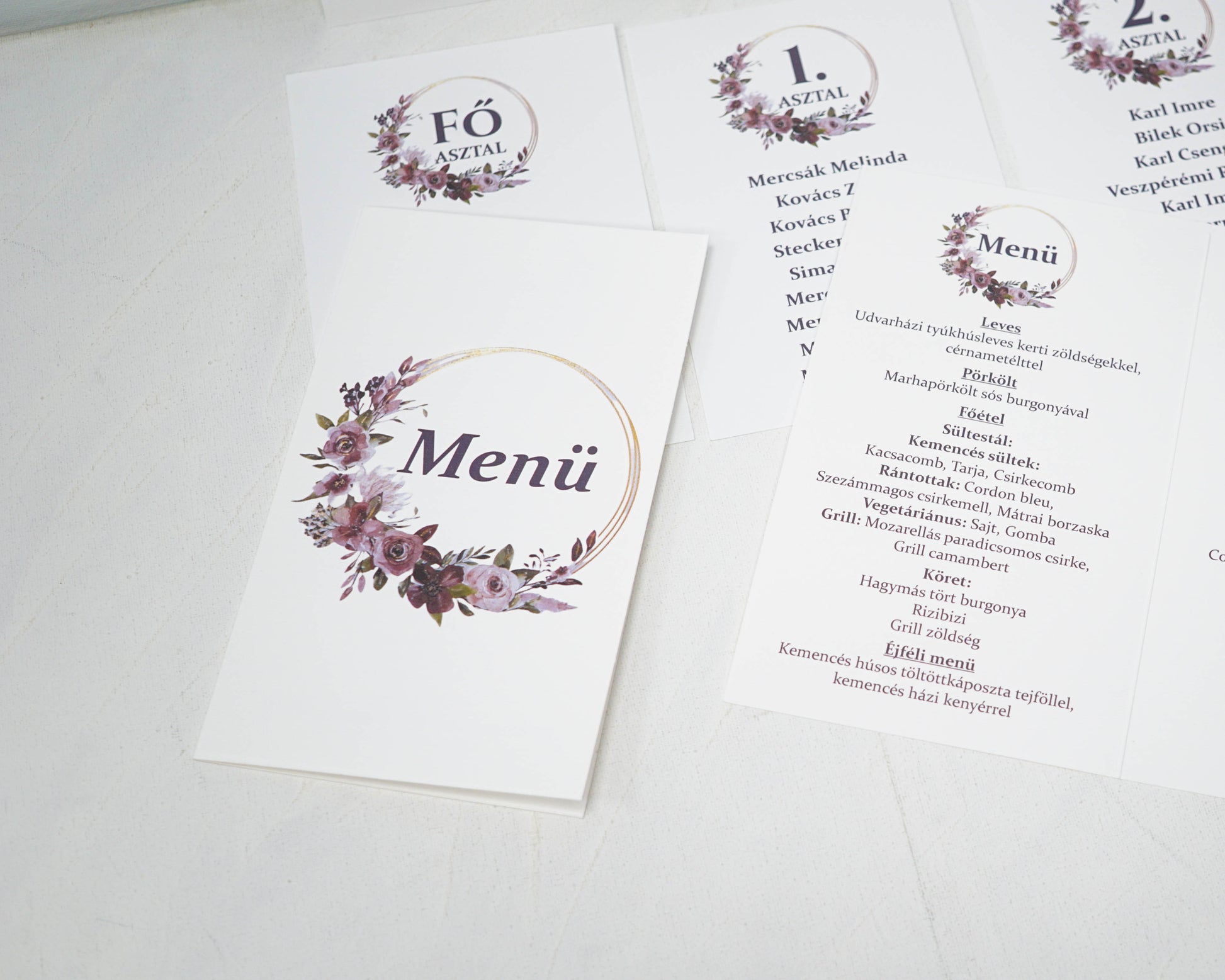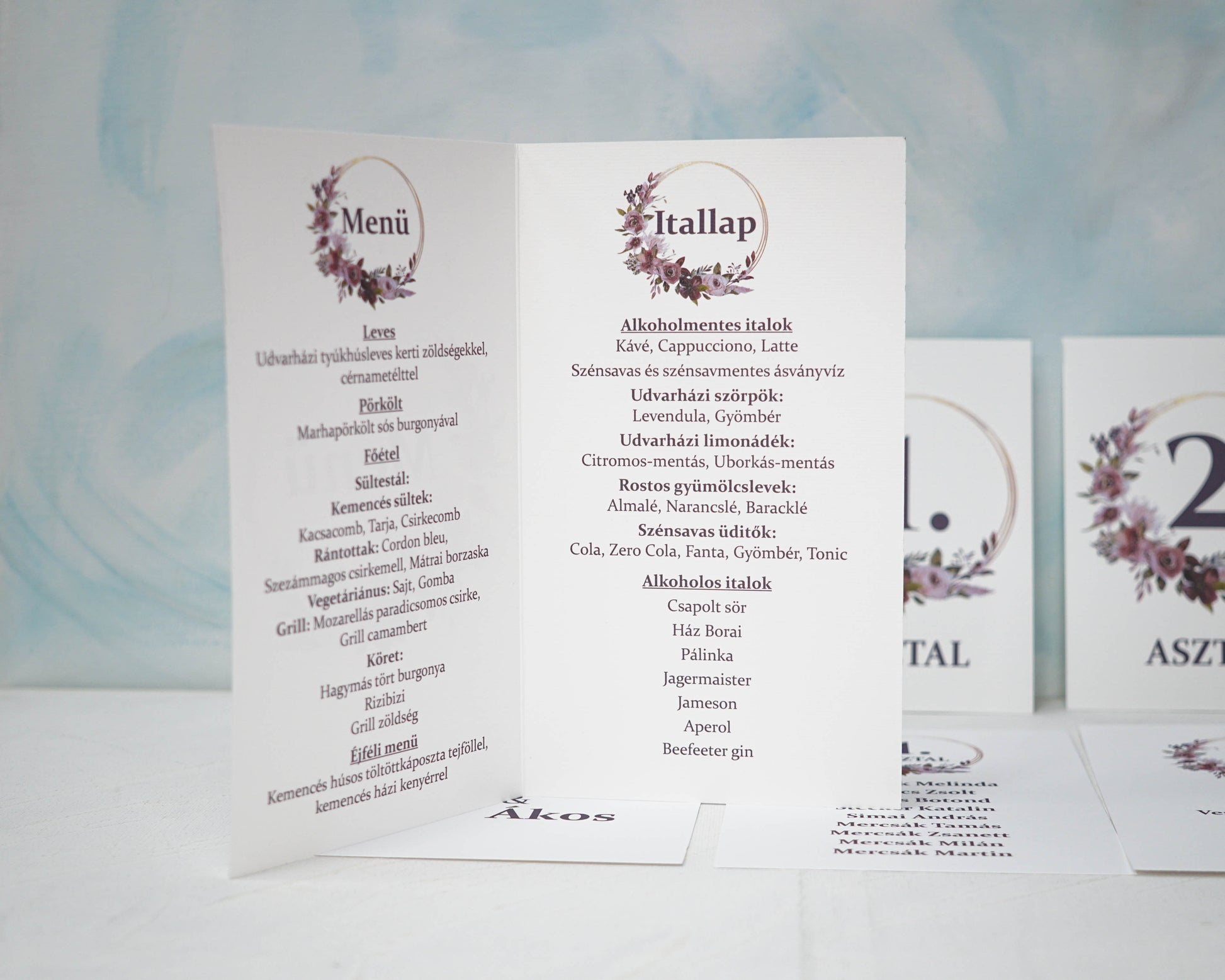 A menü első oldalán fel lehet tüntetni az asztalszámot is, a másodikon az étlapot, a harmadikon az itallapot, de bármilyen egyéb információ is szerepelhet.